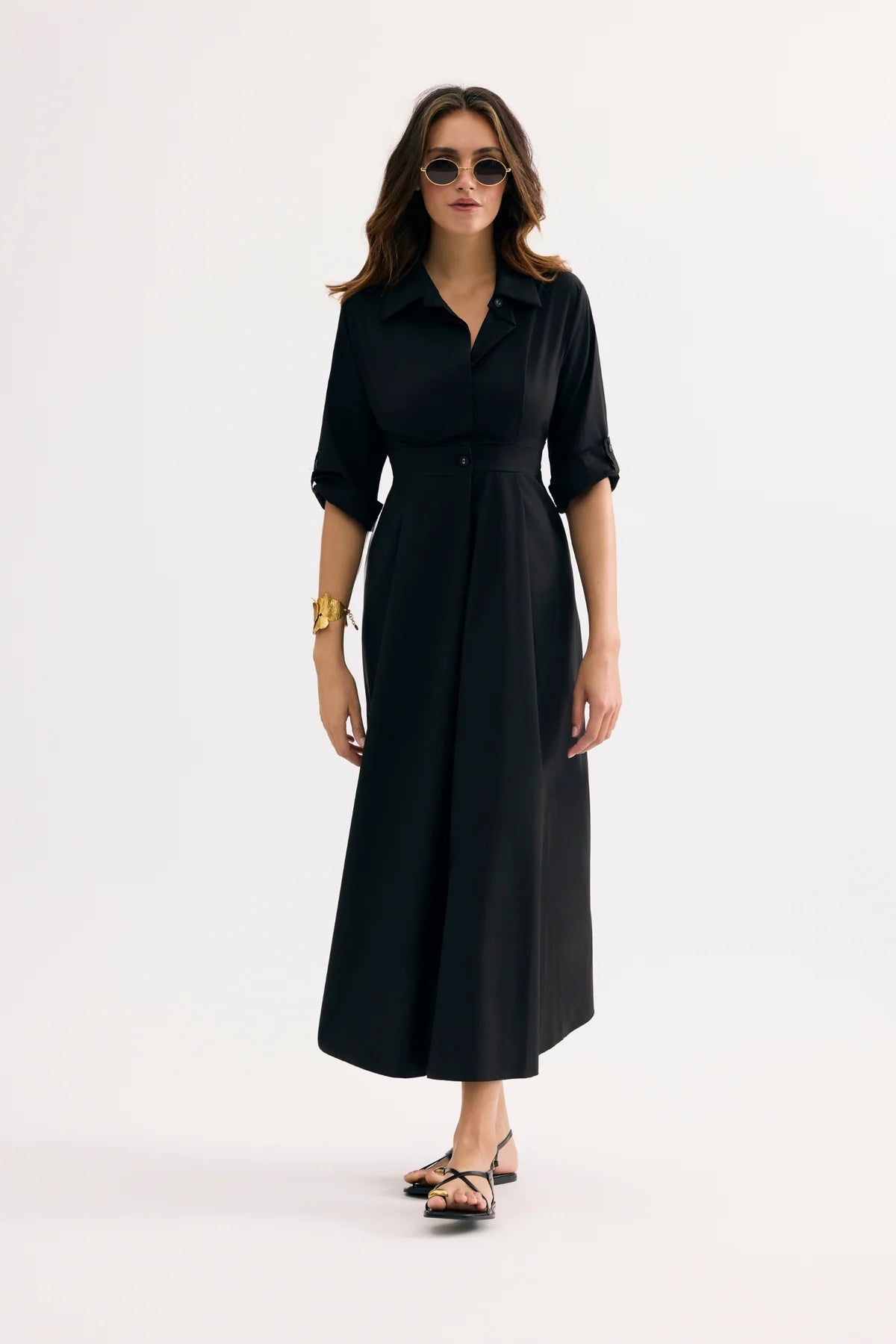 The LAETITIA women's long dress embodies timeless elegance with its flowing cut and subtly defined waist that highlights the silhouette. Its shirt collar adds a sophisticated touch, while the 3/4 roll-up sleeves offer a chic and modern style. Pleated in the back.