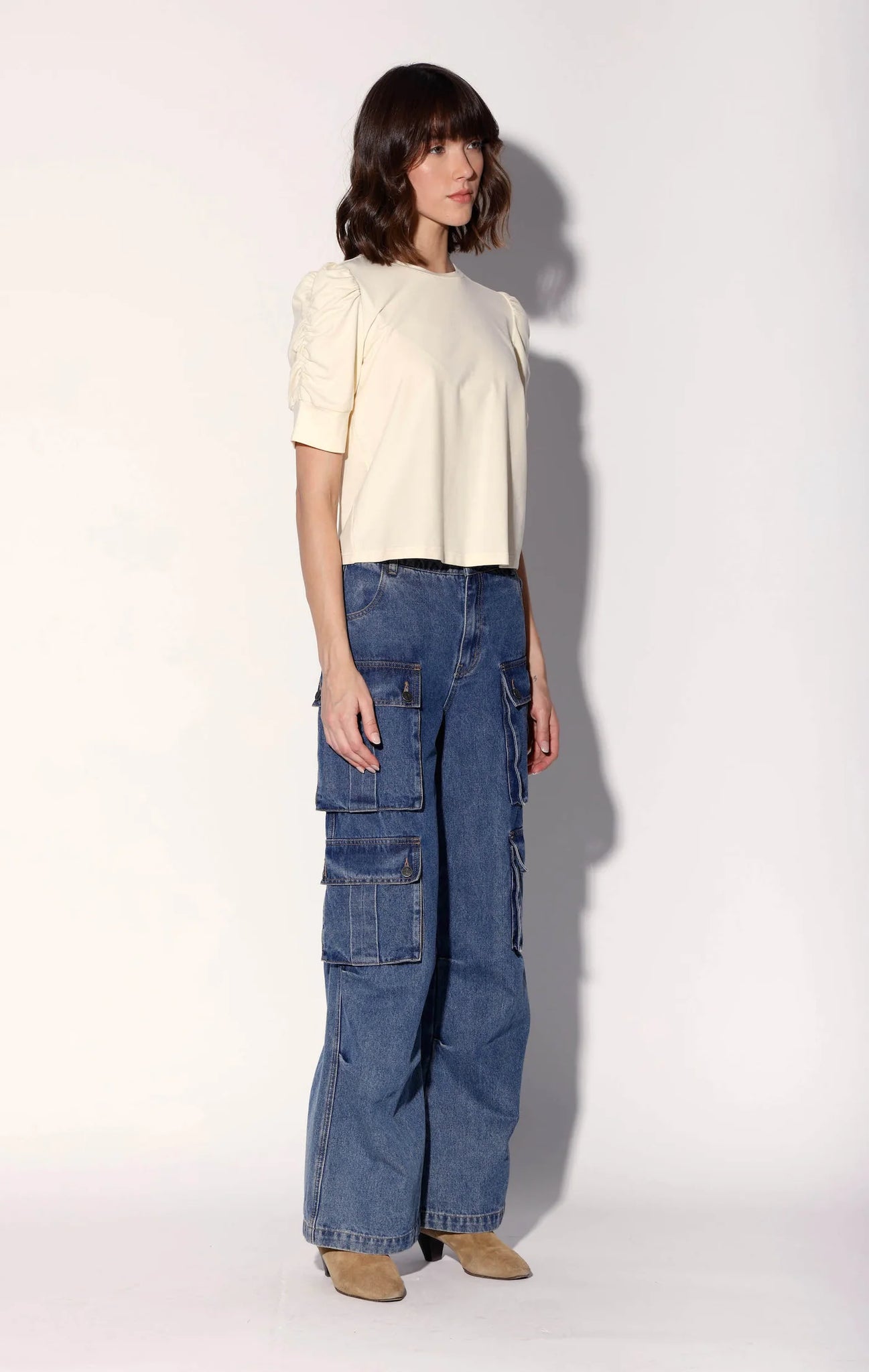 - Elastic shirring on sleeves